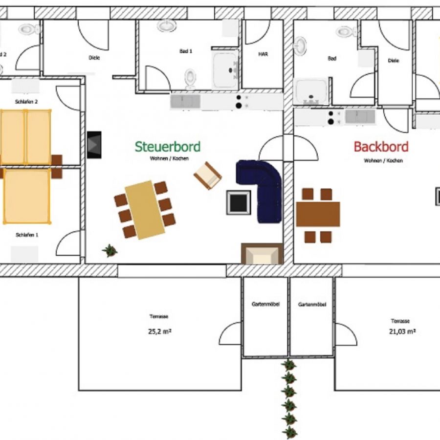 Dieses moderne und barrierefreie EG. Haus mit 2 Schlafzimmern + Schlafsofa im Wohnbereich kann auch gemeinsam mit dem Haus Backbord gebucht werden.